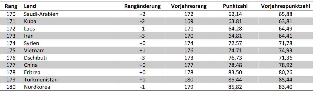 Die erste Tabelle zeigt die ersten 19 und die zweite, die letzten 10 und das letzte Bild gibt eine klare Übersicht der Pressefreiheit weltweit.