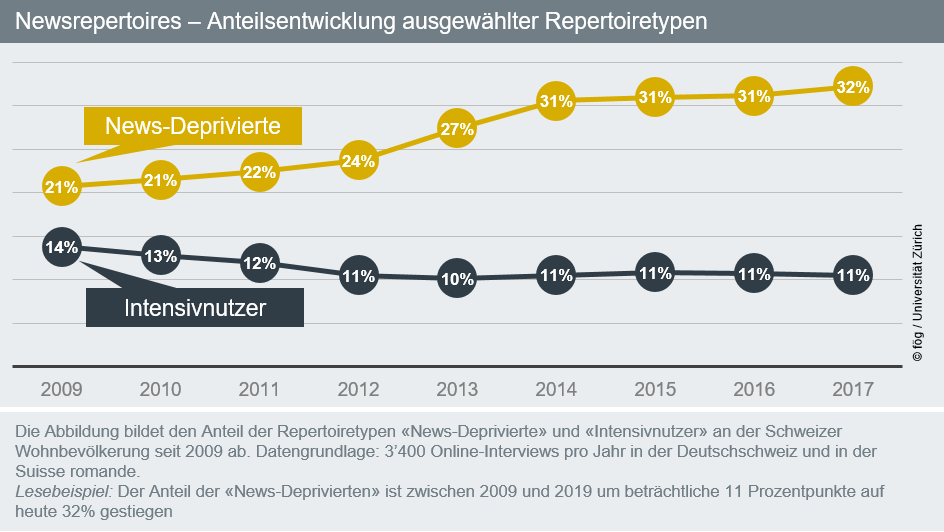 Das Foeg der Universität Zürich veröffentlichte eine Studie bezüglich dem Interesse gegenüber News an der Bevölkerung. Es ist bereits die Rede von «News-Deprivierter» mit diesen Begriff wird der Teil der Bevölkerung bezeichnet, welcher hauptsächlich an der digitalen Medienwelt interessiert sind.